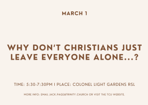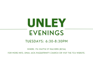 Unley Evenings is a program for our young adults, running on a Tuesday evening during Term time. At Unley Evenings we are passionate about spending time in God’s Word, considering how we might respond to who Jesus is and about growing in community together. Email Jack at jack.page@trinity.church for more details!